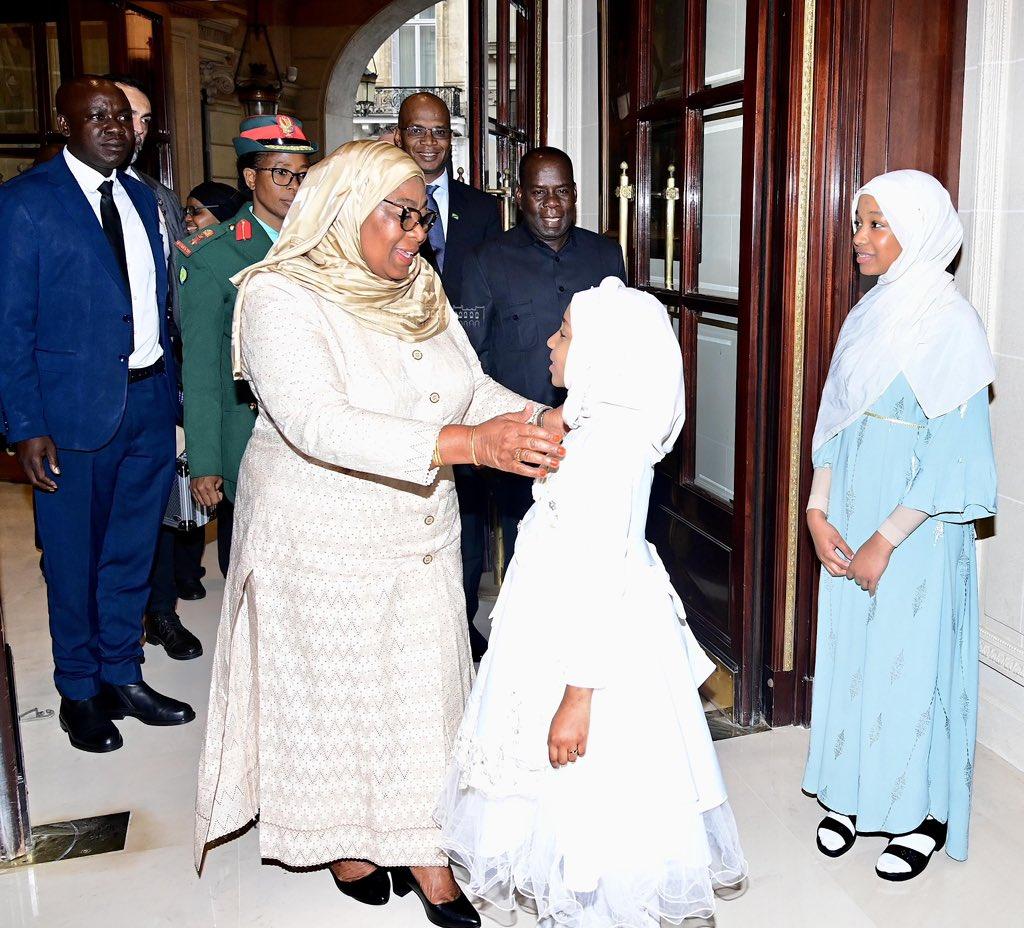 The President of the United Republic of Tanzania, Hon. Samia Suluhu Hassan, engaged in a conversation with the child Khaira Ali Jabir shortlyafter her arrival in Paris, France, to participate in the International Conference on Clean Energy Cooking on 12 May 2024.